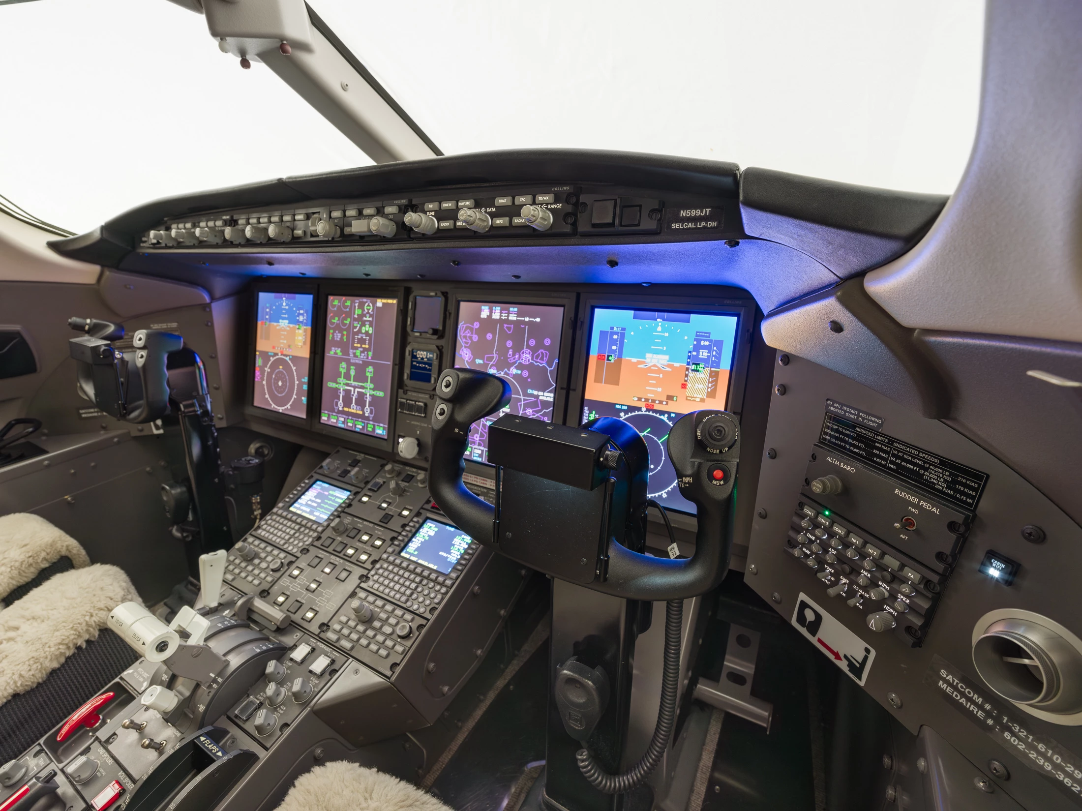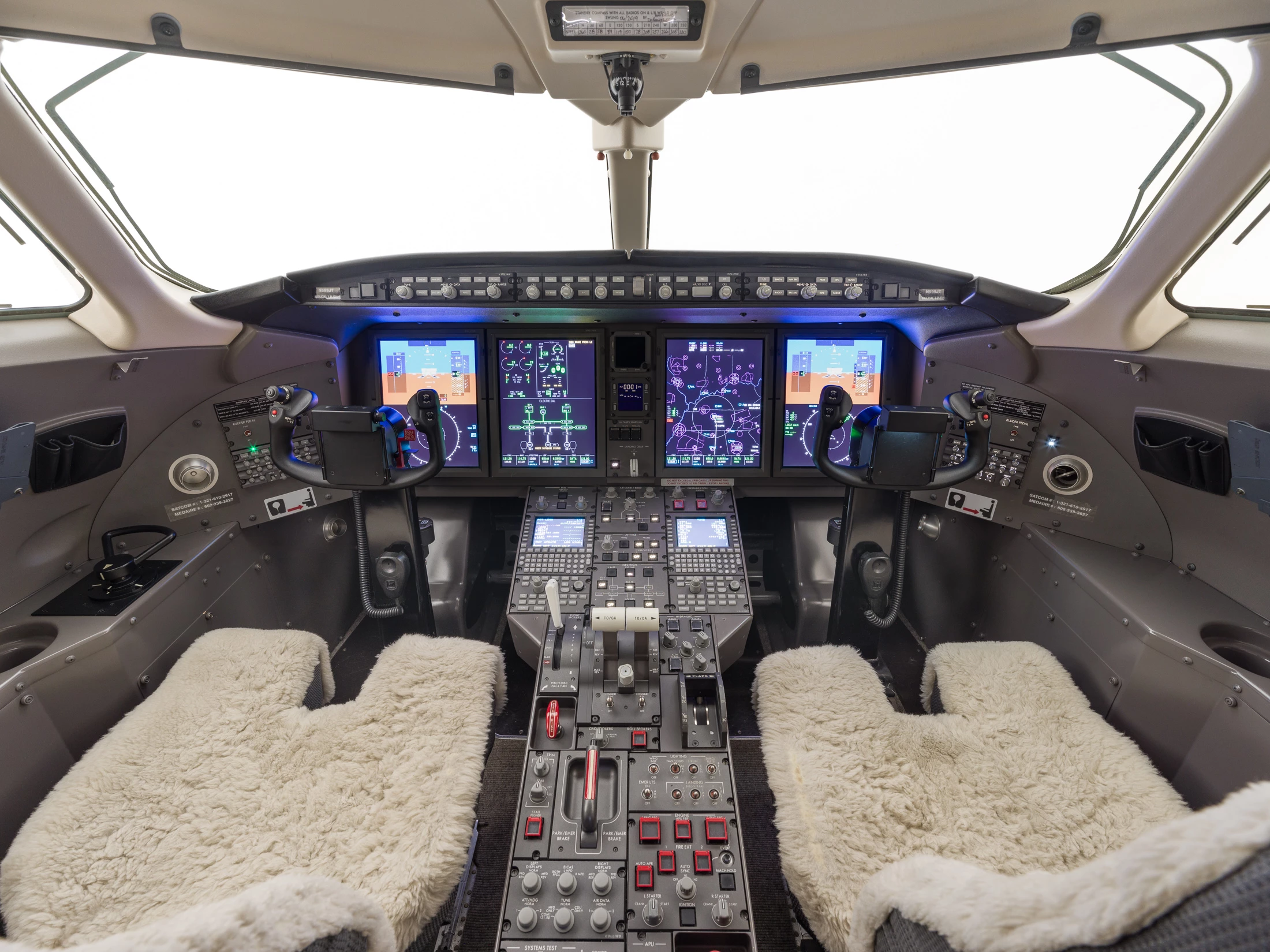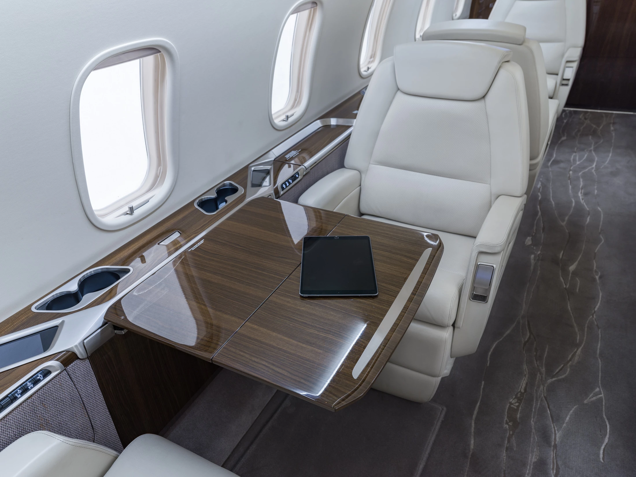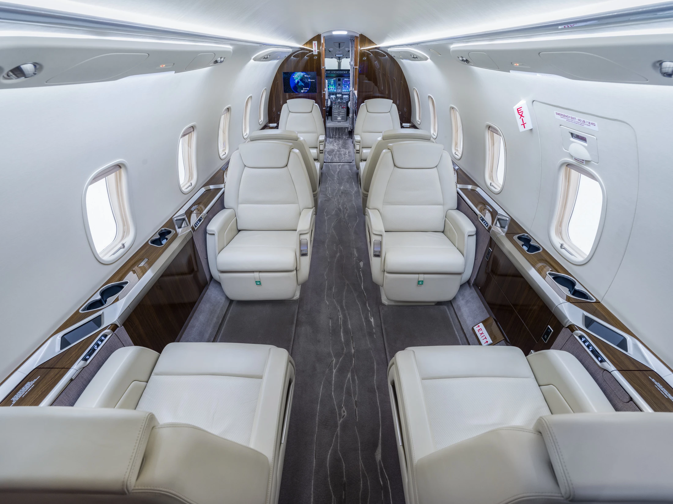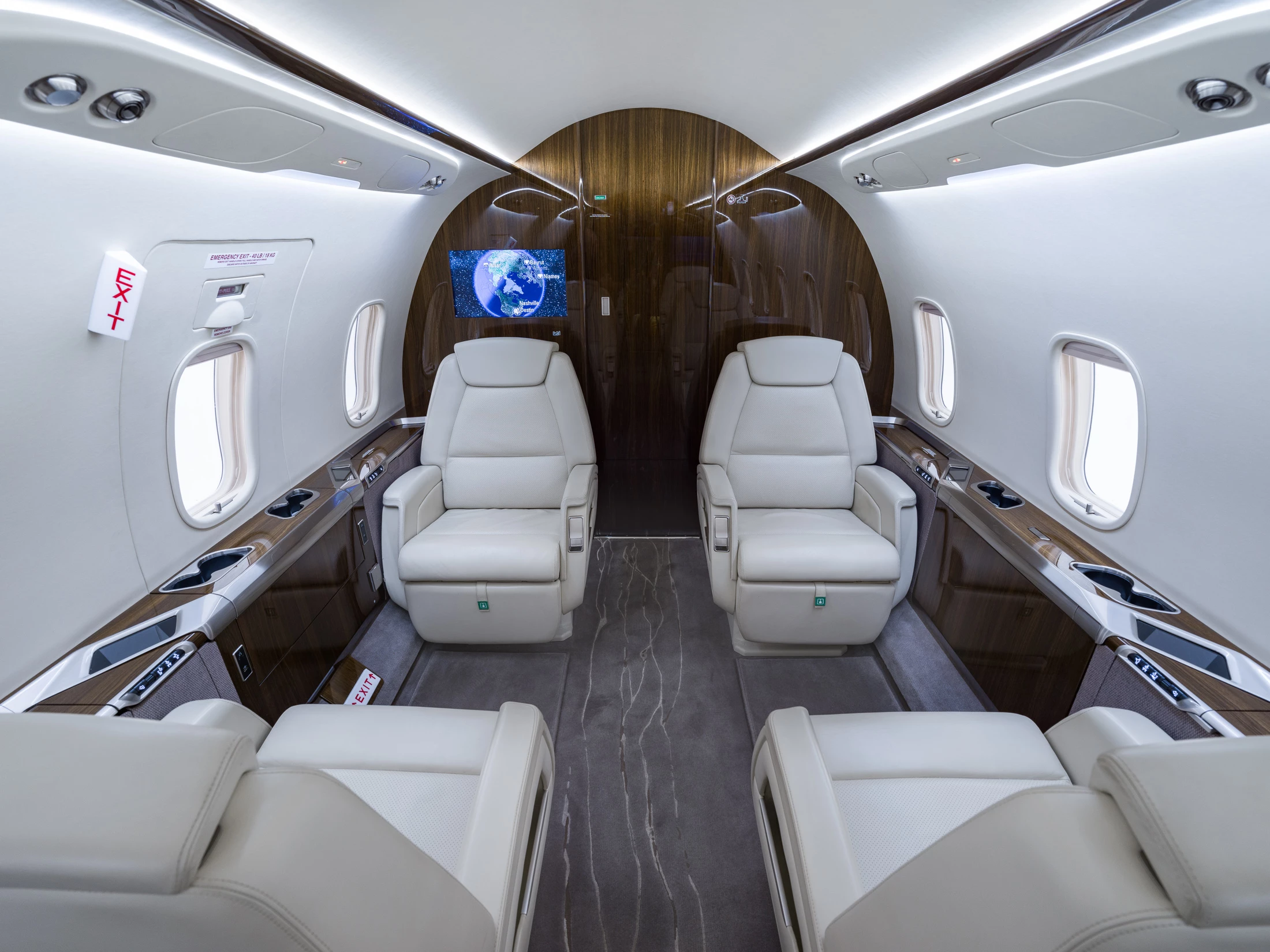 The cabin is arranged in a forward double-club configuration, followed by an aft double-club and a fully belted aft lavatory seat. Light beige leather seating, high-gloss walnut wood accents, and a gray patterned carpet elevate the interior, while clean lines and optimized lighting create a quiet, inviting environment throughout the flight.