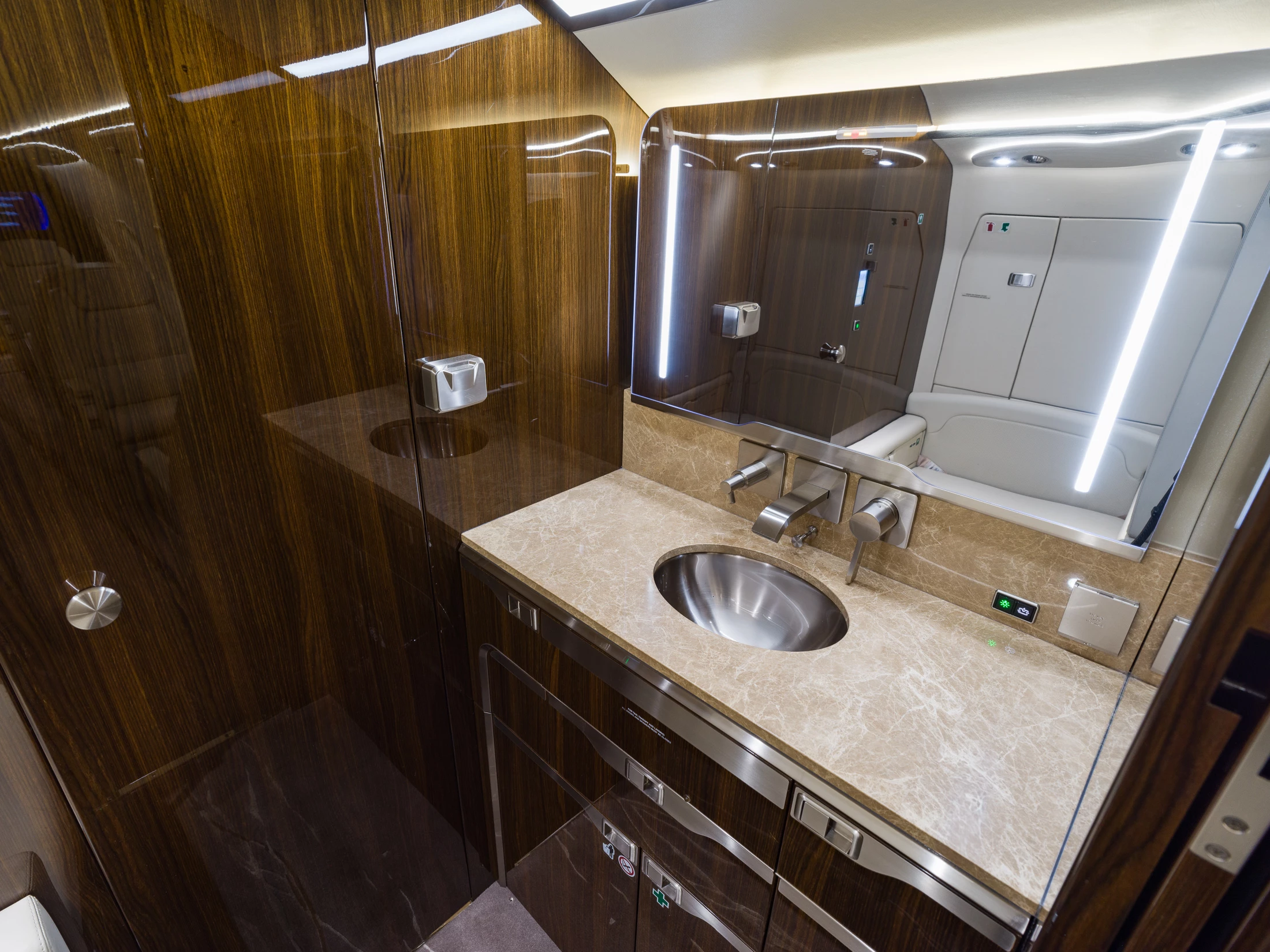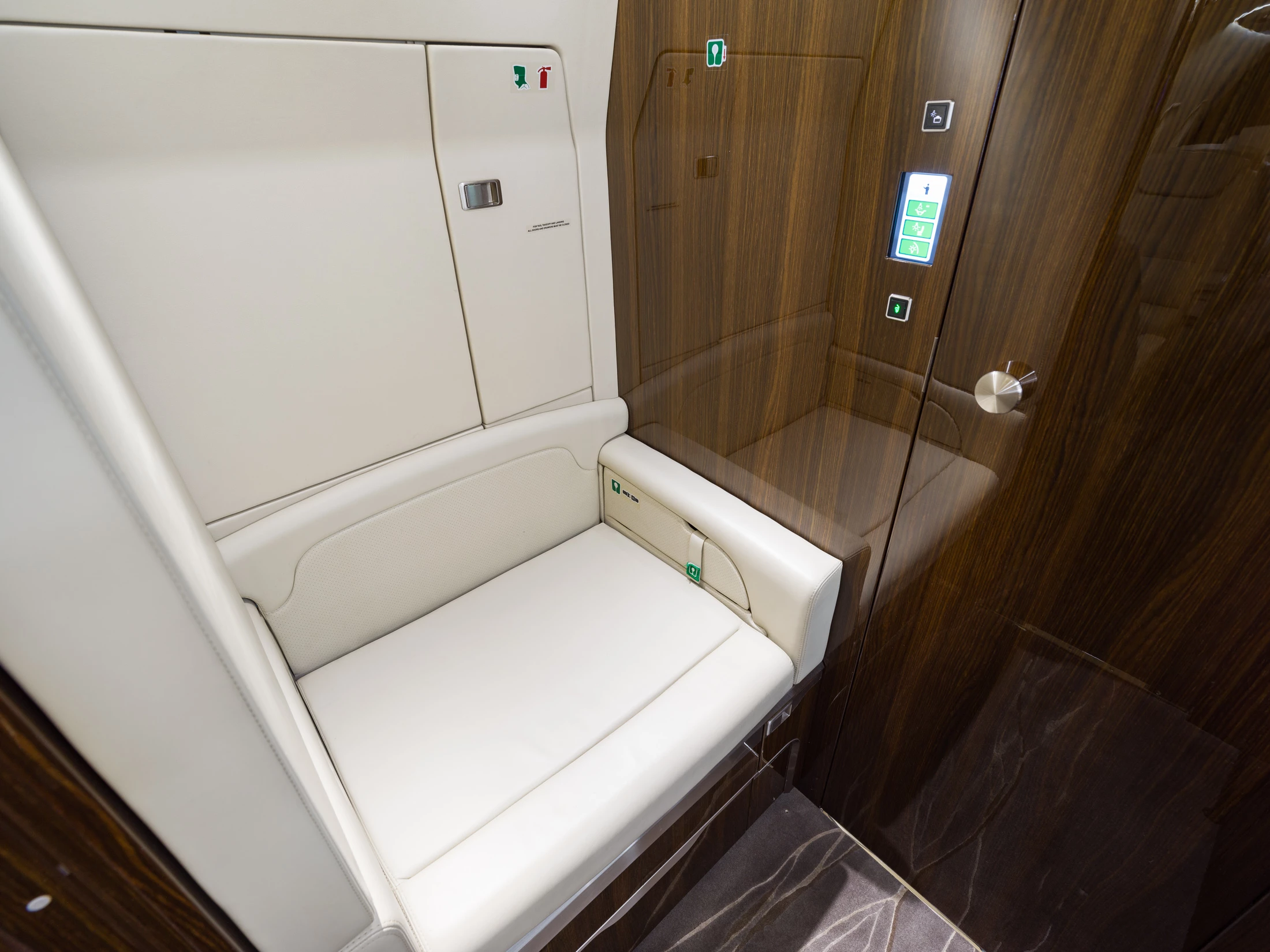 At the rear, the aircraft features a private aft lavatory with a belted seat.