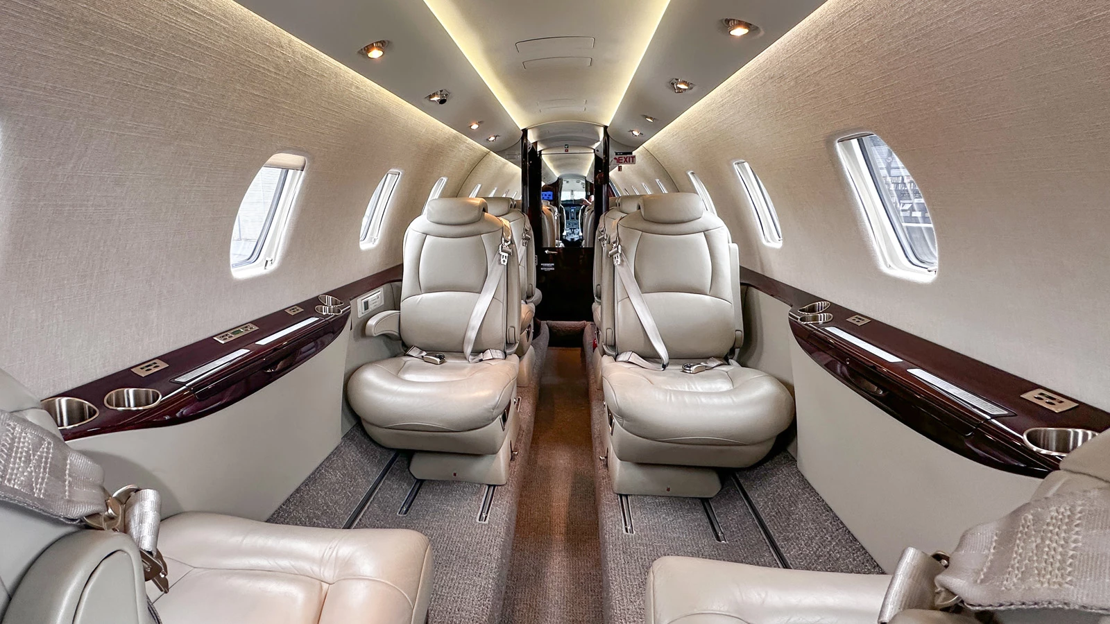 8+1 Cabin Seat Configuration, 4 Club Seats; 2 single fwd. Seats, double seat Couch and belted Toilet Seat, Cabin and Cockpit AC Power Outlets (115V), Lavatory with Sink and sliding door for privacy, 2 additional foldable Pax Tables on seats 7 & 8, Satcom (Aircell), AXXII WIFI (GoGo), ATG 4000 Broadband, 10.4” LCD Airshow, Hot Coffee Pot, RosenView Cabin Briefer