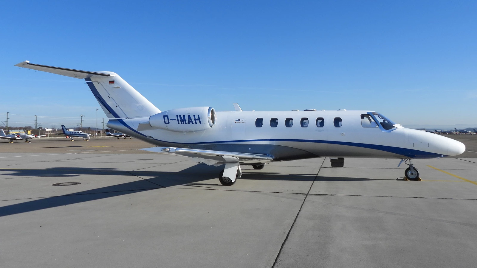 Six (6) passenger executive seating in beige leather (four club seating, two single fwd. facing seats), one side facing seat (7) plus belted lav seat (8), brown carpet, brown wood veneer (gloss laminate), lavatory separated by a sliding door for privacy, slim refreshment center (hot Cup), brushed aluminum hardware, Cabin information Display (AvVisor Plus), 110 V AC Cabin and Cockpit power outlets.