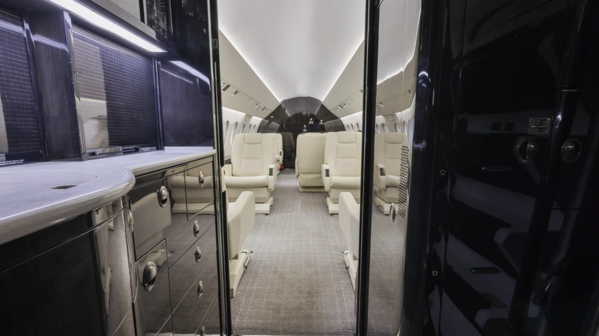 outfitted with an aft lavatory. The woodwork finish is black ebony veneer with a grey carpet. Forward bulkhead