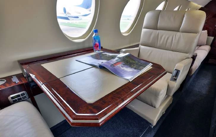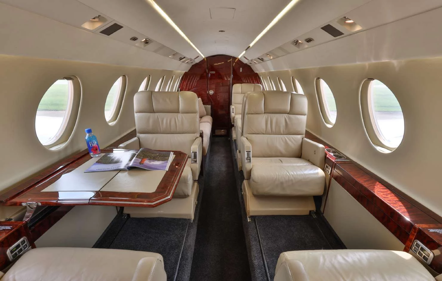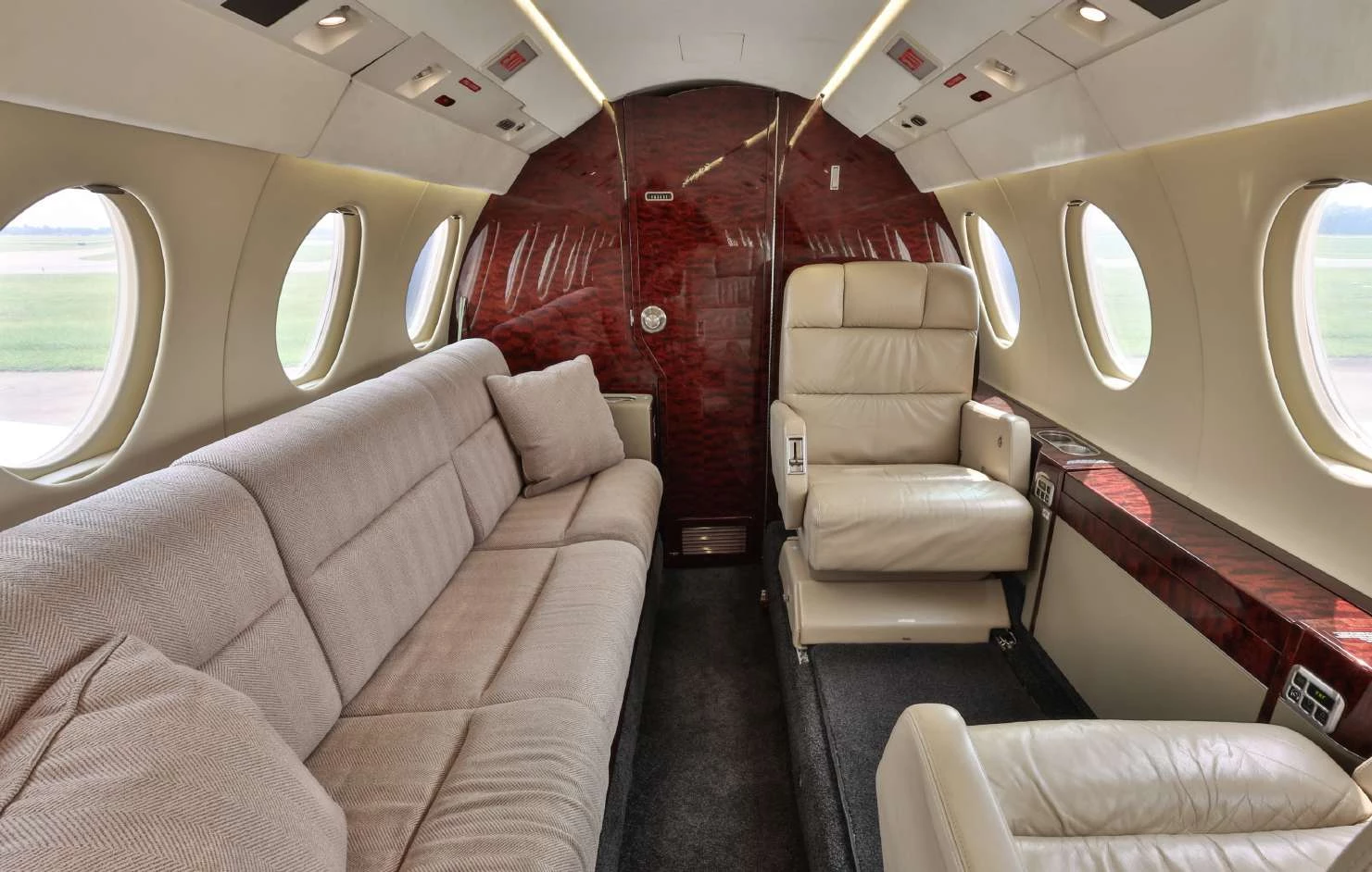 Nine (9) passenger interior offers a third crew member seat. The cabin is configured with a large forward galley followed by a four (4) place club arrangement and an aft three (3) place divan opposite two (2) club chairs. Individual chairs are completed in light tan leather, the divan is covered in a coordinating lightly patterned fabric and new carpeting (2020). The high gloss dark colored woodwork is complimented by the Satin Nickel plating.