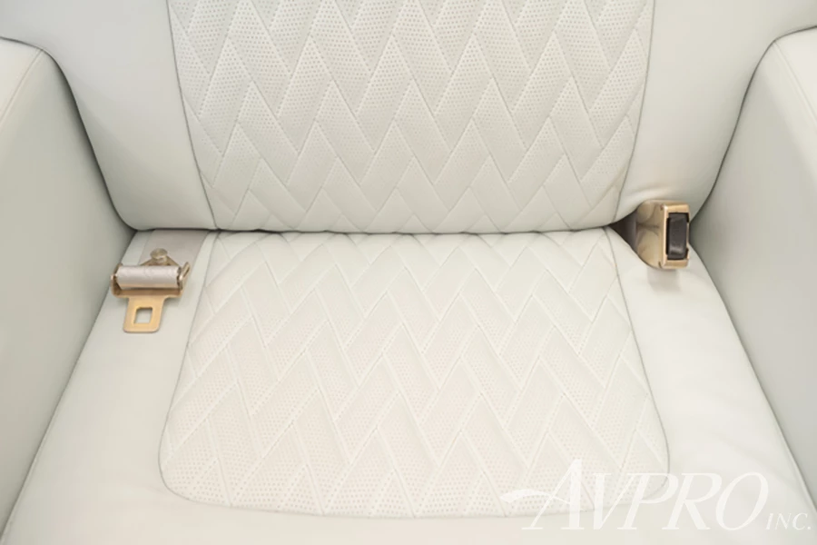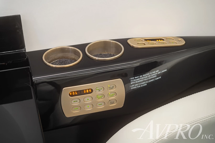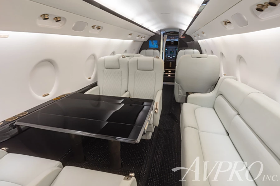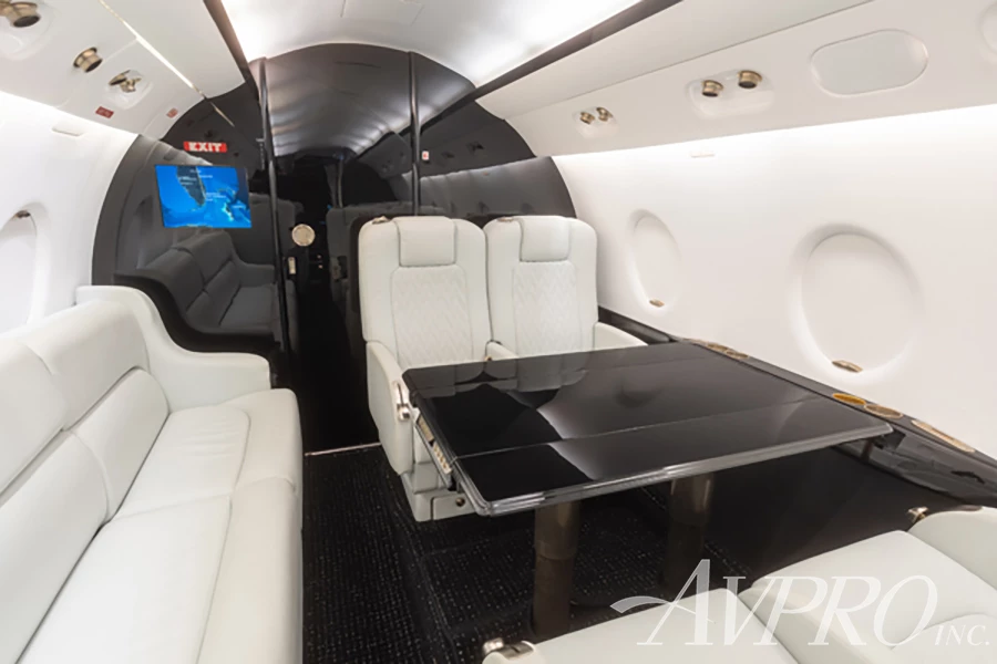 Elegant ten (10) passenger interior featuring a fully equipped forward galley followed by a forward four (4) place club arrangement and an aft four (4) place conference group opposite a (2) place berthable