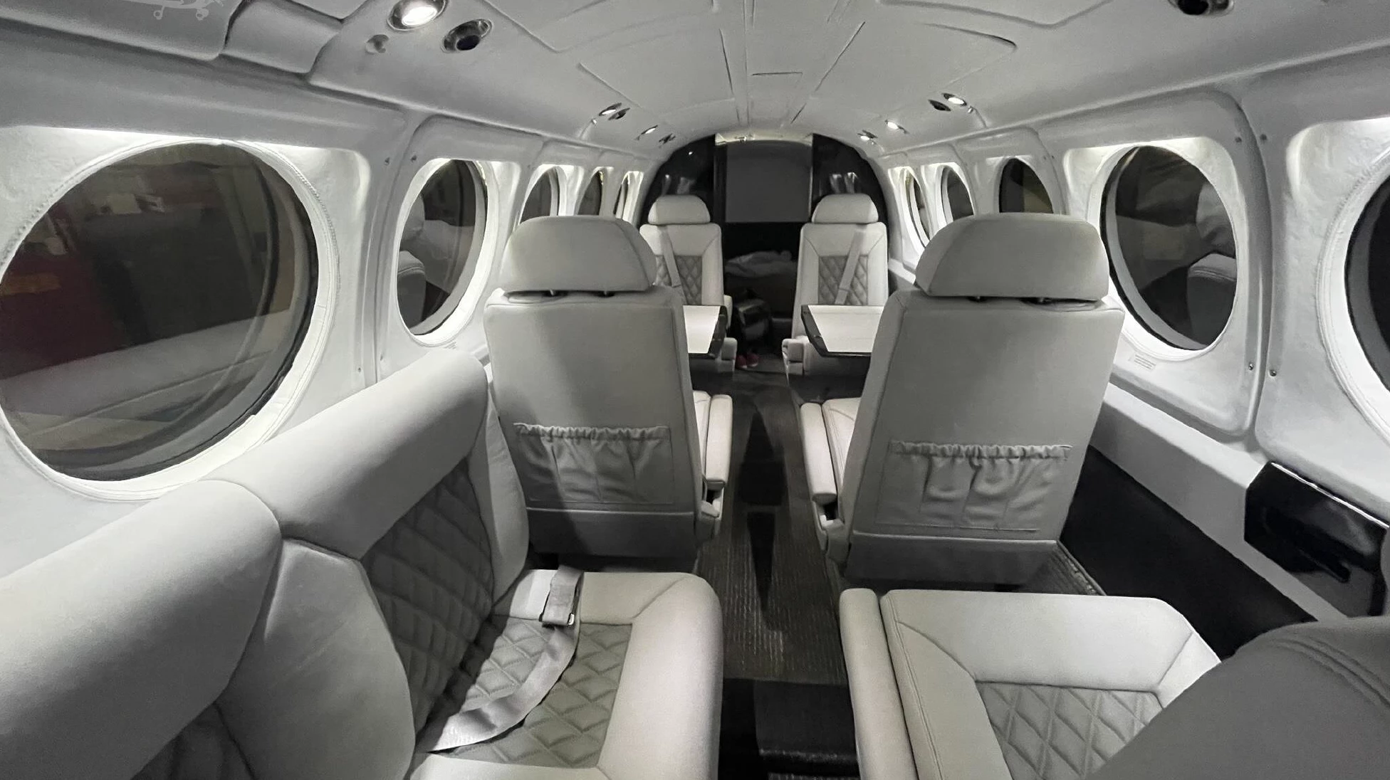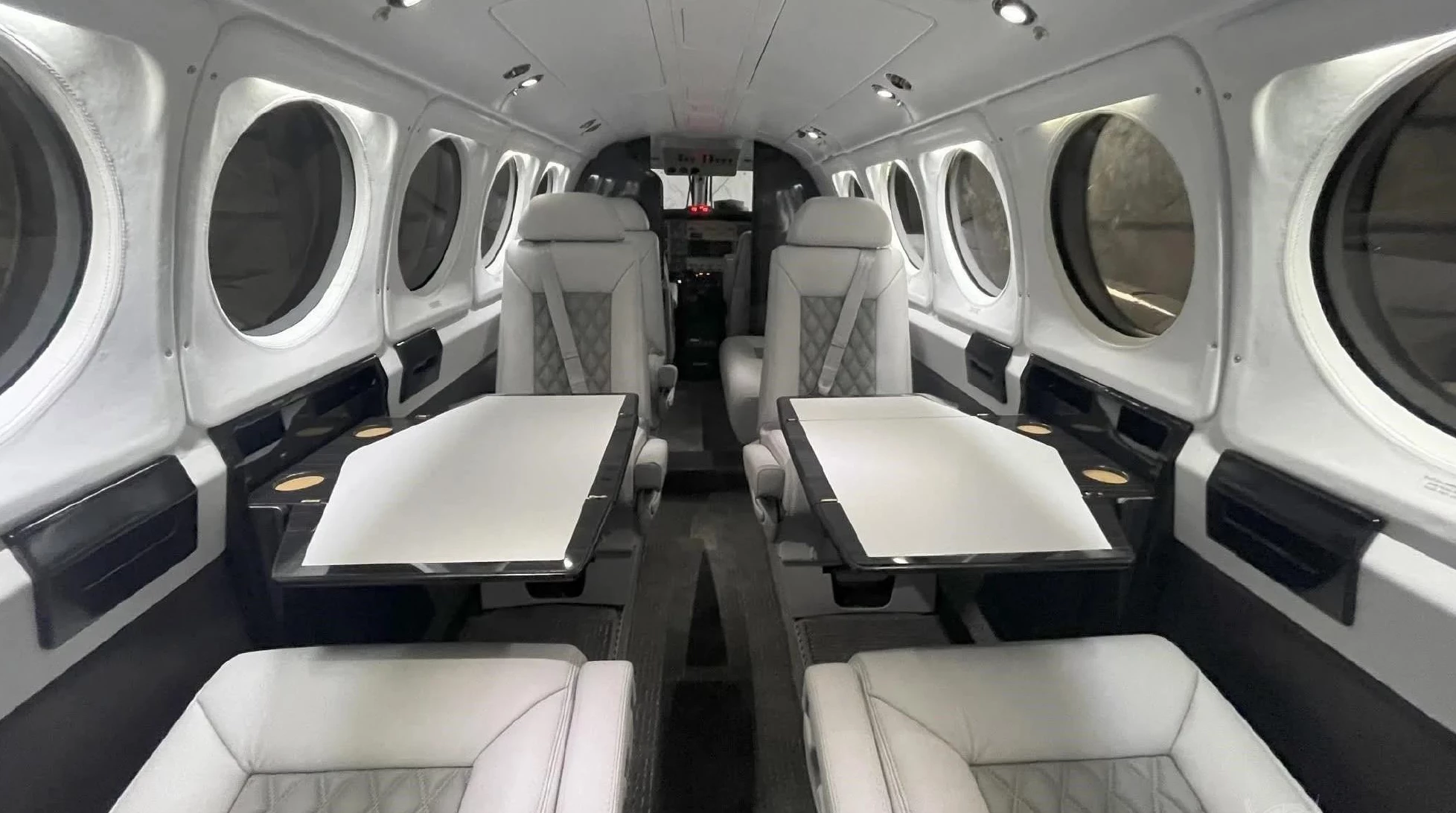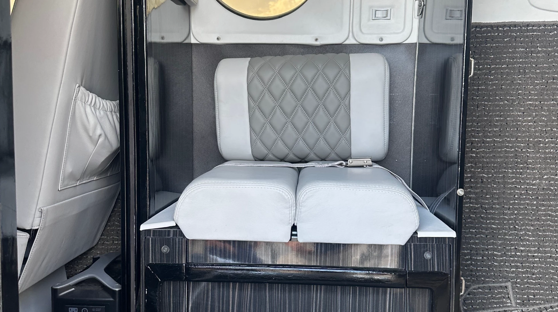 Cool gray monotone elite leather seating, forward side-facing 2-place divan, 4-place club with Dual stowable executive tables