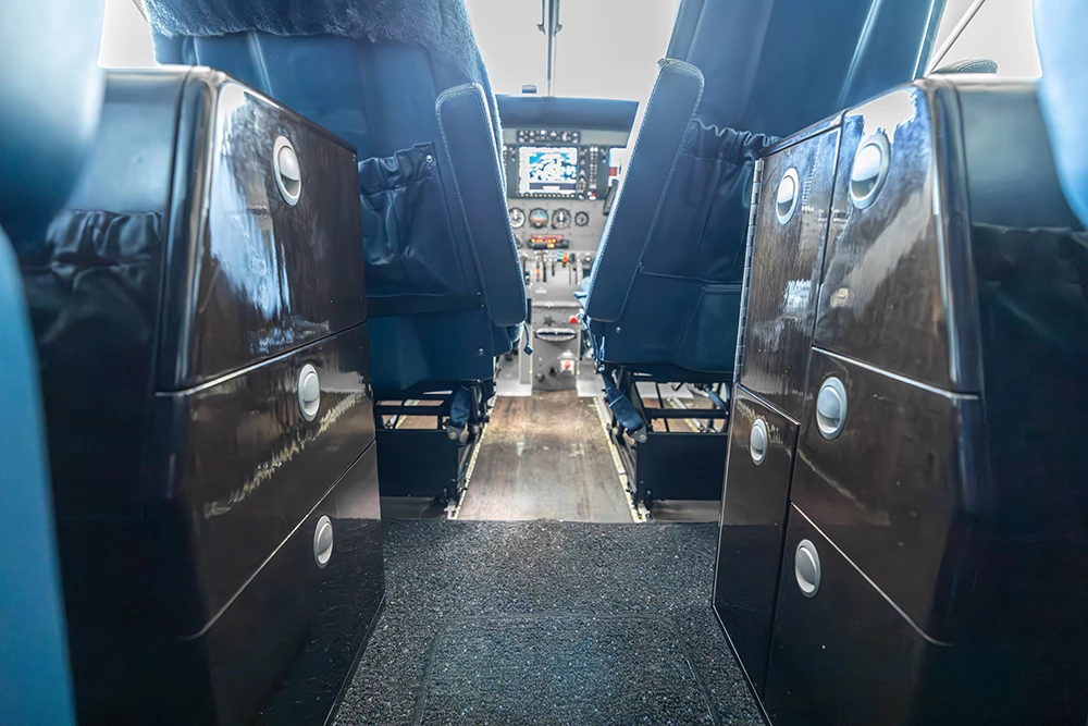 Eight passenger executive interior with center club seating, right hand refreshment center, left hand storage center, cockpit center console, flushing aft potty, ASIC pilot and co-pilot door storage. The executive interior was installed by Capital Aviation in 2021.